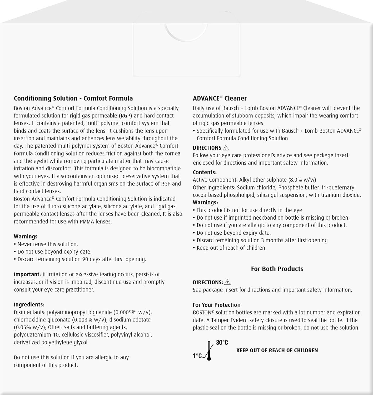 - MAINTAINING HEALTHY EYES: Boston Advance Cleaner will prevent accumulation of stubborn deposits, removes protein and lipid deposits and our Conditioning Solution is effective in destroying harmful organisms on the surface of RGP and hard contact lenses